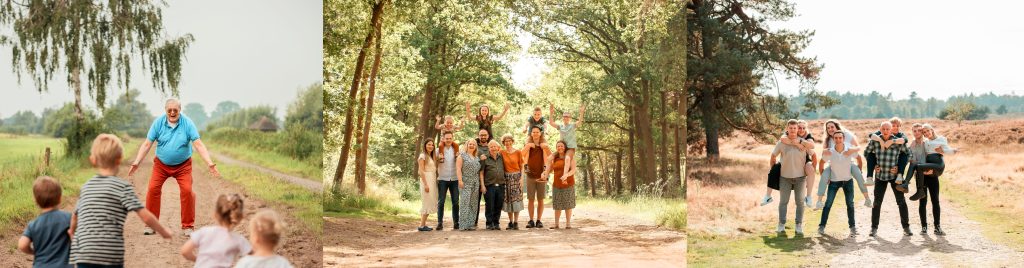 Een stukje lopen, juichen, knuffelen met opa en oma en bij elkaar op de rug. Door middel van kleine opdrachtjes creëren we echte momenten. Op die manier hebben jullie spontane, sfeervolle foto’s én een leuk familieuitje!