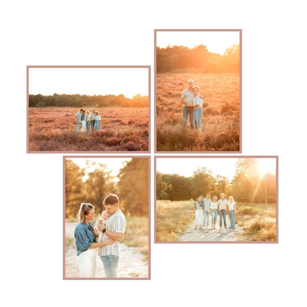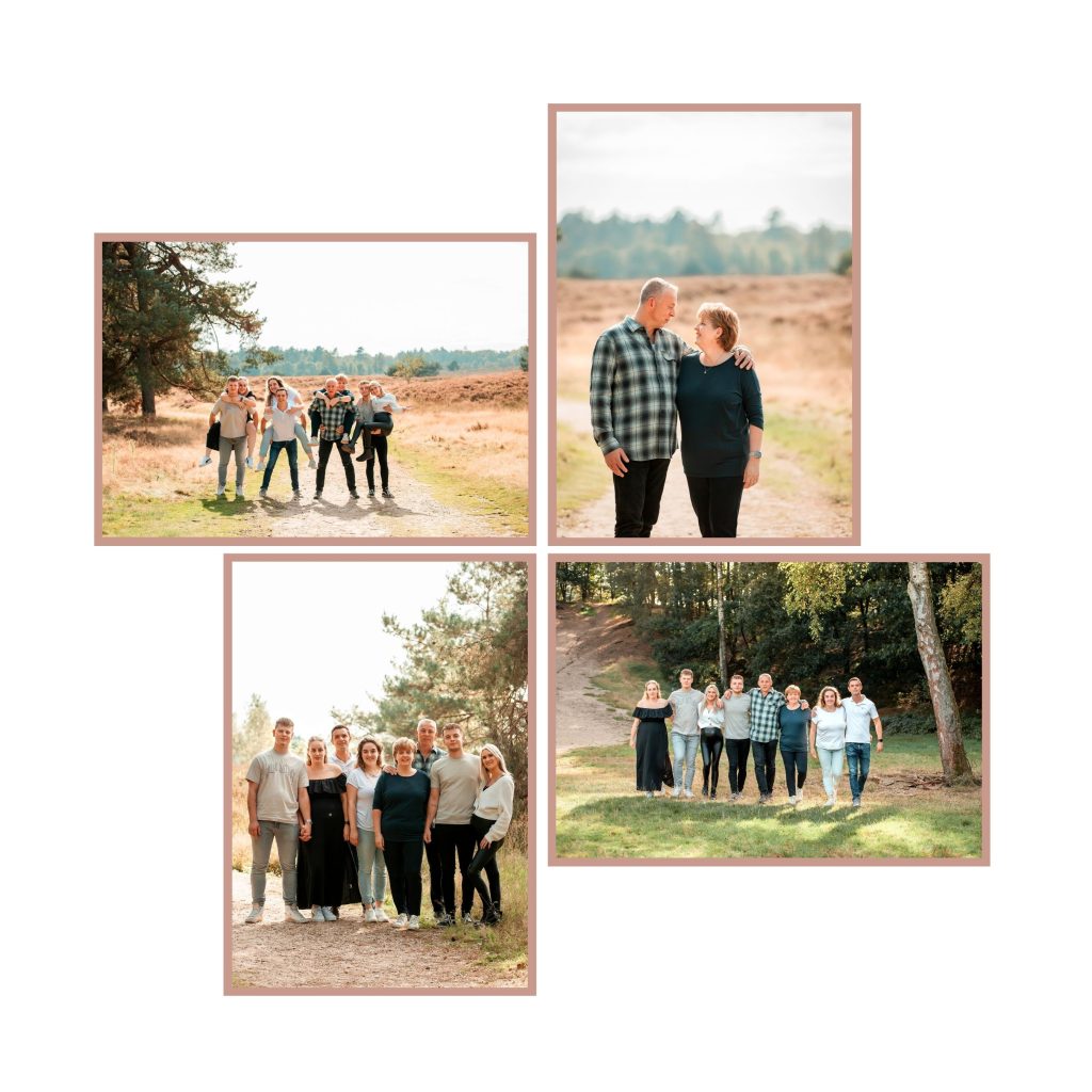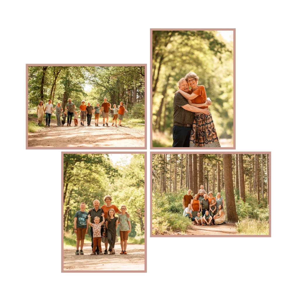 Naast de foto’s met de hele familie, maken we ook foto’s van de gezinnen en koppels apart. Maar ook van opa en oma met de kleinkinderen, alle kleinkinderen samen en meer! Maak vooraf een lijstje welke ‘groepjes’ je allemaal op de foto wilt hebben, zo weet je zeker dat we niets vergeten.